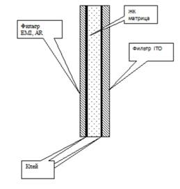 Пример 1 - с двумя фильтрами (два клеевых слоя), один из которых с антиотражающим покрытием (AR+EMI), а второй – с нагревательным слоем(ITO). |